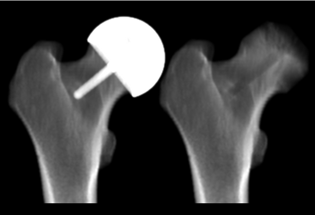 The “virtual x-rays” are created by “mapping” the bone densities from the numerical model onto the three planes of a specified coordinate system, such that x-rays in any desired plane are able to be generated. Images can be created with or without the implant, such that areas normally obscured in DEXA images are visible in “virtual x-rays”.
