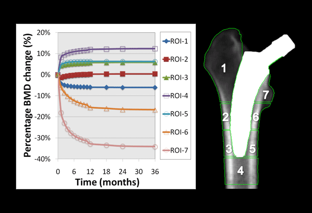 Clinical studies typically use Dual Enery X-Ray Absorptiometry (DEXA) to evaluate changes in Bone Mineral Density (BMD). In such studies, DEXA images are taken pre-operatively and then post-operatively approx every 6-12 months. These images are then compared and the changes in BMD over time for a number of Regions of Interest are established. Although clinical studies using DEXA play an important role in the evaluation of the long-term performance of medical implants, they cannot be used to predict the long-term outcome of a device.