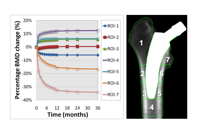 At various points in time “virtual x-rays” were created and analysed to give the changes in the Bone Mineral Density (BMD) for several Regions of Interest (ROIs) over time, similar to a clinical DEXA study.